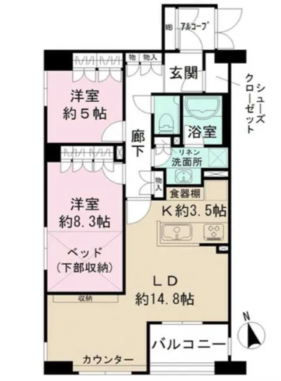 | ペット | ペット相談可 | 間取り内訳 | LD=14.8J / K=3.5J / BR=8.3J / BR=5J |
