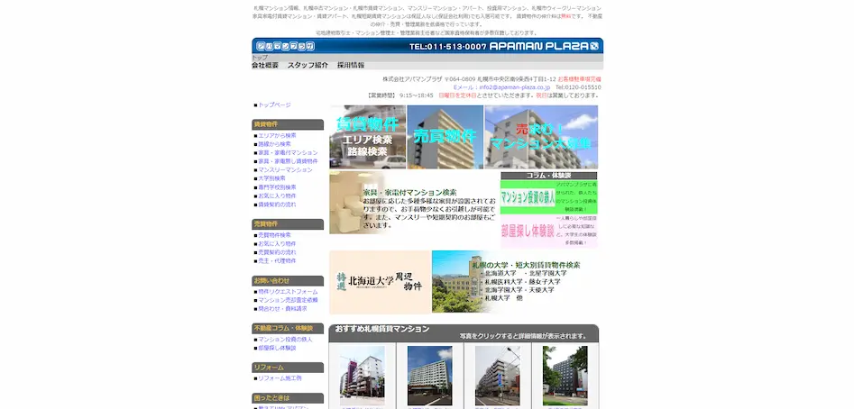 株式会社アパマンプラザは、札幌を中心に不動産仲介や賃貸、売買、管理業務を低価格で提供している不動産会社です。札幌市内の賃貸マンションやアパート、中古マンション、マンスリー・ウィークリーマンションなど多様な物件を取り扱っており、短期賃貸でも保証人なしで入居可能な物件をご用意しております。また、賃貸物件の仲介手数料は無料で、コストパフォーマンスに優れたサービスを提供しています。