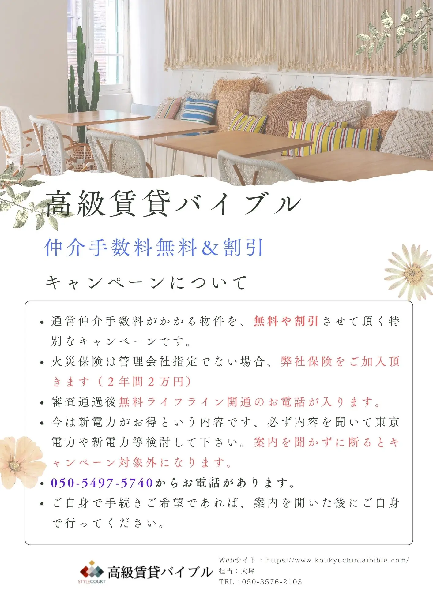 - 通常仲介手数料がかかる物件を、無料や割引させて頂く特別なキャンペーンです。