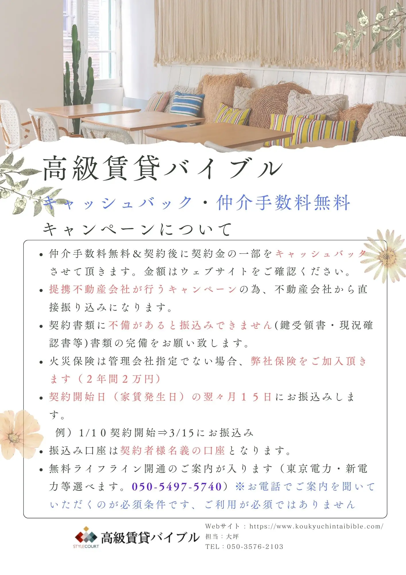 - 仲介手数料無料&契約後に契約金の一部をキャッシュバックさせて頂きます。金額はウェブサイトをご確認ください。